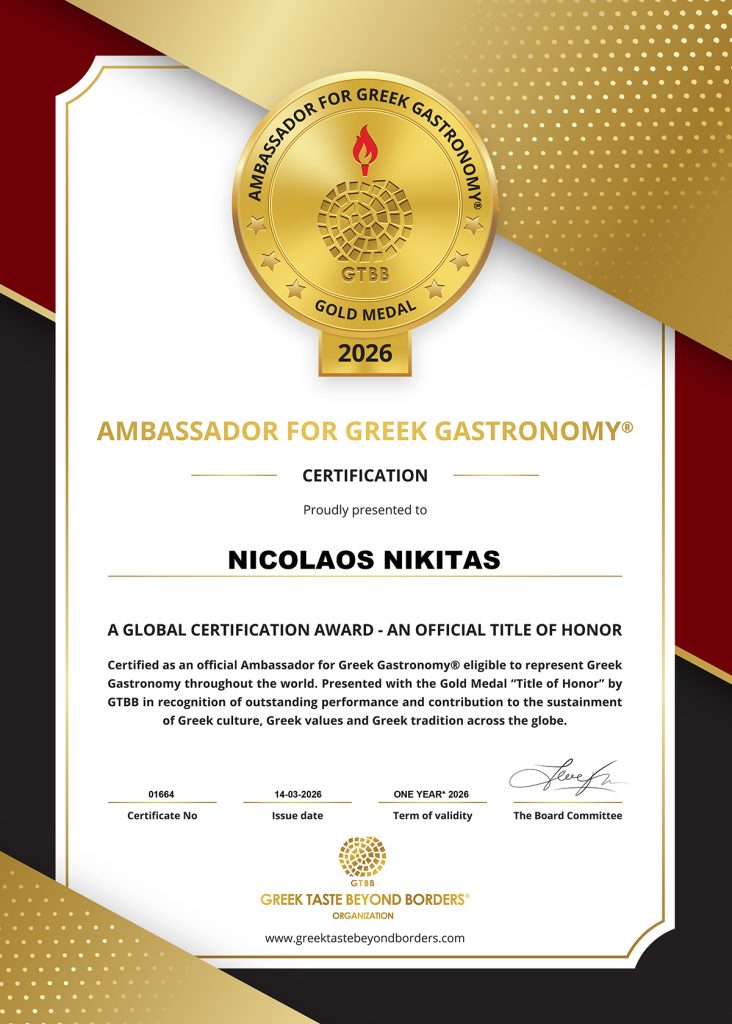 NIKOLAOS NIKITAS was recently certified & awarded by the GREEK TASTE BEYOND BORDERS® GTBB organization with the CERTIFICATION OF VALUE & QUALITY GOLD MEDAL 2021 for his remarkable career and sustainable role in Greek gastronomy as one of the top chefs representing Greek culture.