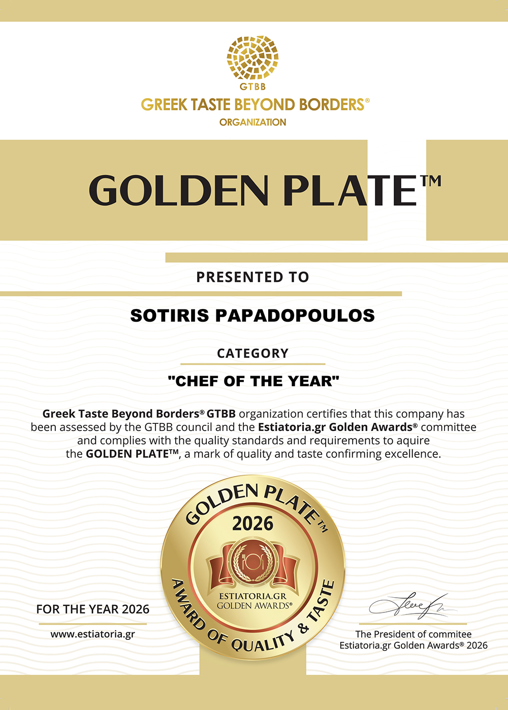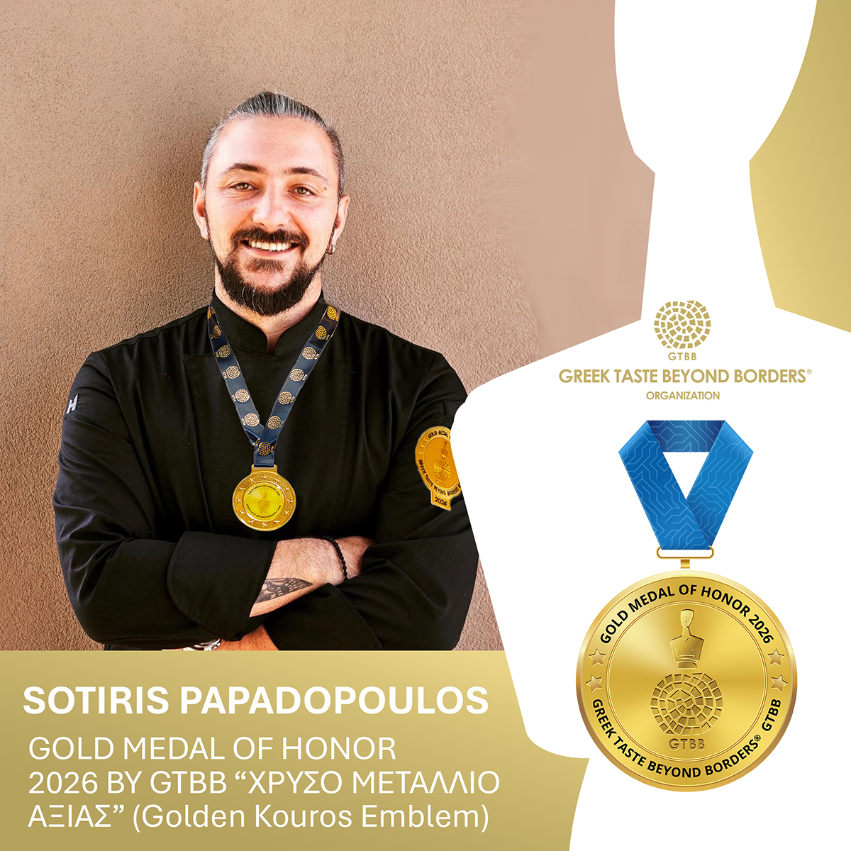 Είναι βραβευμένος απόι τον παγκόσμιο οργανισμό GREEK TASTE BEYOND BORDERS® GTBB με το GOLD MEDAL OF HONOR by GTBB “ΧΡΥΣΟ ΜΕΤΑΛΛΙΟ ΑΞΙΑΣ 2026” του GTBB με έμβλημα τον Χρυσό Κούρο “Golden Kouros Emblem”. Επίσης έχει κατακτήσει και τον τίτλο Chef of the Year 2026 στα Golden Plates™